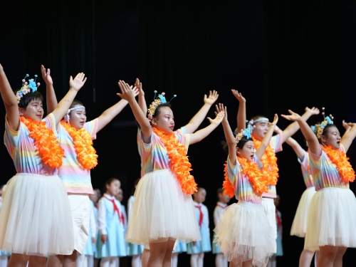 在最后的彩排現(xiàn)場,孩子們?nèi)褙炞ⅲ魳返墓?jié)奏,一遍又一遍地重復(fù)著每一個動作、每一句歌詞。老師們站在臺下,眼神緊緊關(guān)注跟隨,引導孩子們“表情微笑,非常漂亮!”“保持隊形,互相保護好身邊的同學”。